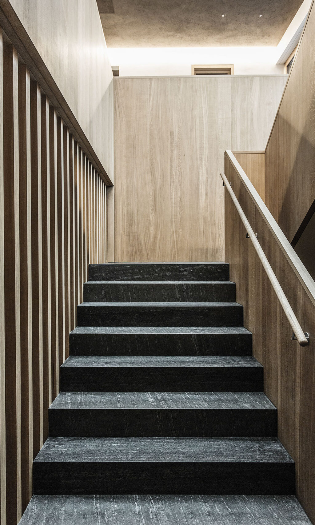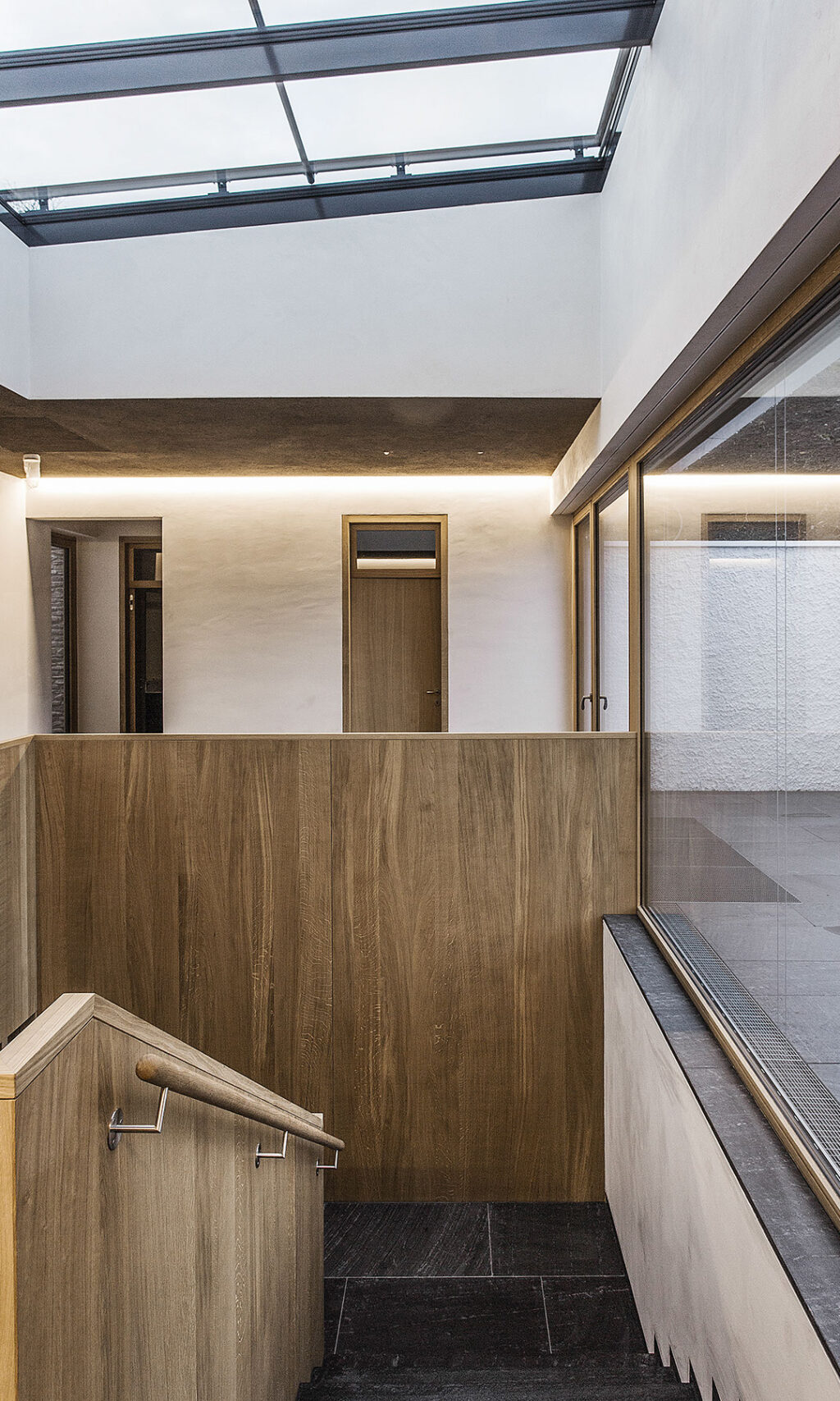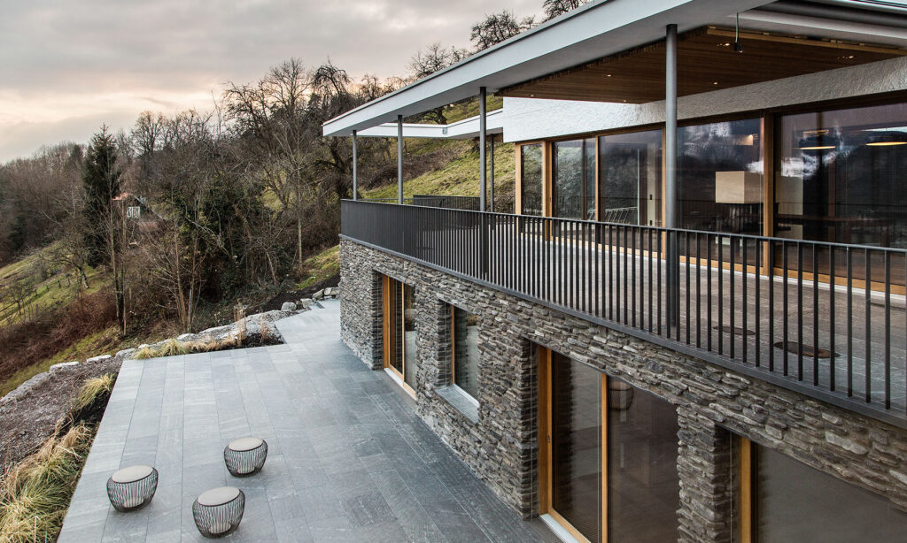 Das Einfamilienwohnhaus ist auf einem nach Süd-Osten orientierten Hanggrundstück in Feldkirch-Levis gelegen. Der Neubau staffelt sich in vier Ebenen dem Hangverlauf folgend. Über eine Zufahrt von der Straße erreicht man den Vorplatz mit Garage, Lager und dem zurück versetzten Hauseingang. Das Erdgeschoss, welches völlig eingegraben im Hang sitzt, umfasst Lager sowie Technikräume. Das 1. Obergeschoss beherbergt die Schlafräume mit Bädern und Ankleiden. Außerdem ist hier ein Gästezimmer, ein Büro, sowie hangseitig die Waschküche platziert. Die Schlafräume orientieren sich talwärts zu einer großen Terrasse. Das Wohngeschoss ist im 2. Obergeschoss untergebracht. Hier erstreckt sich ein großzügiger Wohn/Essbereich mit offenem Kamin, sowie die Küche. Hangseitig gliedert sich ein Innenhof an den Wohnbereich an. Talseitig befindet sich eine große teilweise überdeckte Terrasse mit wunderschönem Ausblick über die Stadt Feldkirch. Über dem Stiegenhaus erhellt ein großes Oberlicht den Gang und das Stiegenhaus. Das Einfamilienhaus wurde in Massivbauweise erstellt. In den Fassaden wechseln Flächen von Naturstein und weißer Putzfassade ab. Die Stützmauern des Untergeschosses wurden in Sichtbeton ausgeführt, welche mit Rankpflanzen bewachsen werden.