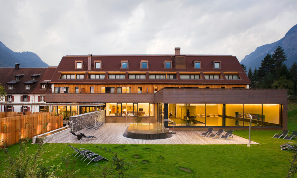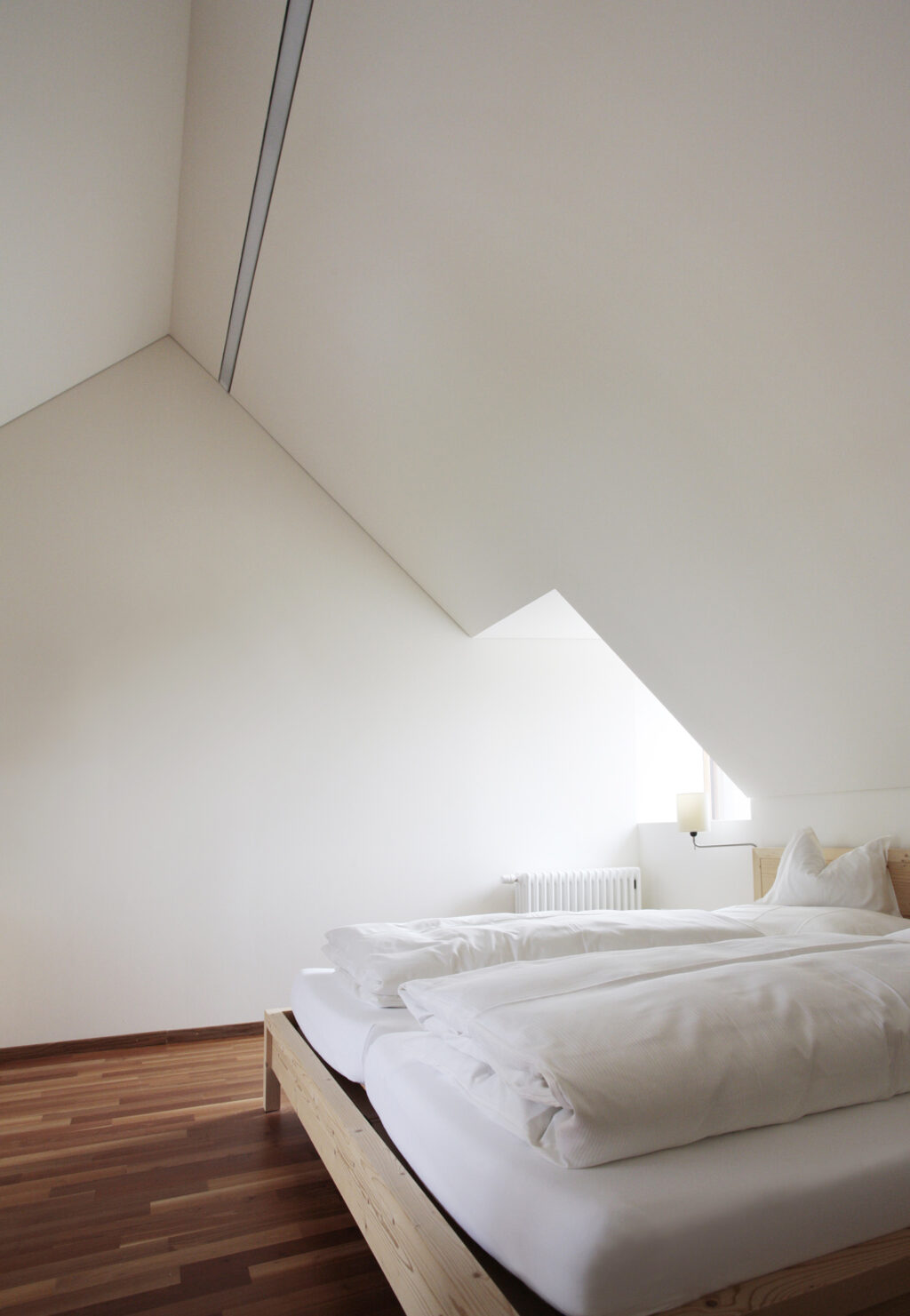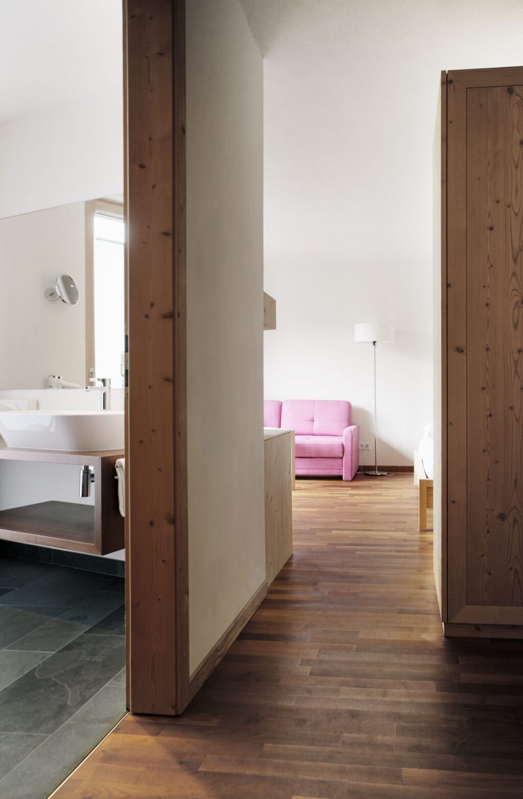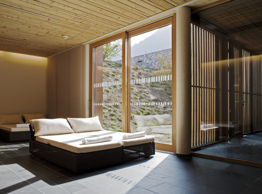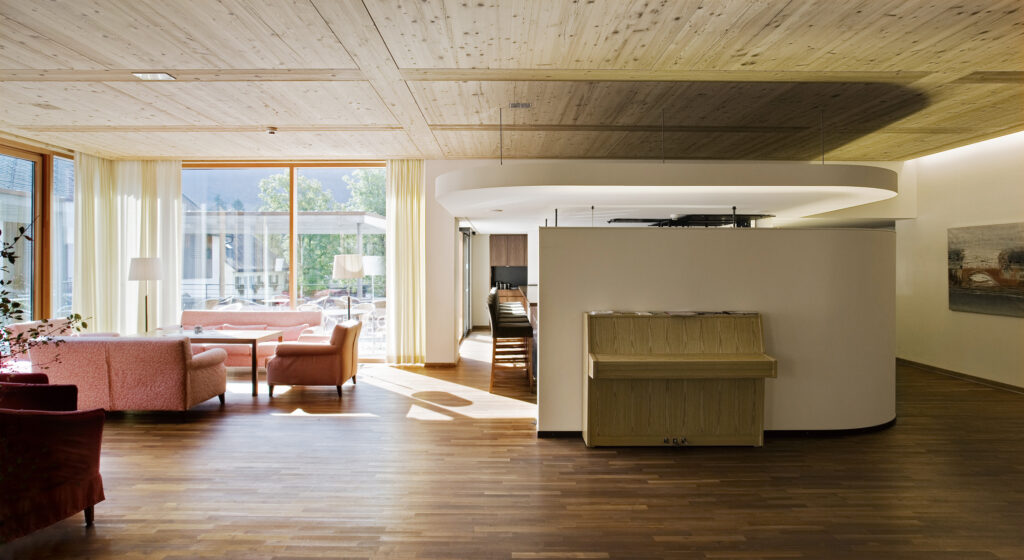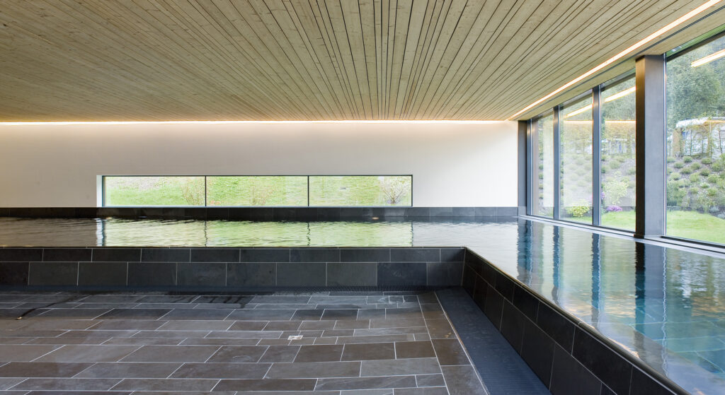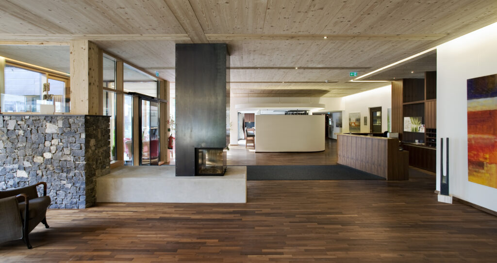 Das altgewachsene, geschichtsträchtige Hotel Gasthof Traube in Braz ist ein besonderes Projekt. Dem Zeitgeist und den Entwicklungen der Region und Gesellschaft immer gleich auf, entfaltet es sich weiter, baut um, erneuert, optimiert sich. Diese Bauphase zeigt den Empfang und die neue Eingangshalle, in der sich eine Bar, wie auch ein kleiner Shop befindet. Weil die Traube und wir um den hohen Wert der Gemütlichkeit wissen, findet sich inmitten all der unterschiedlichen Bereiche ein offener, großzügiger Kamin, der den Raum mit wärme und zartem Licht erfüllt. Im Anschluss an die Rezeption gelangt man in eine weitere, privatere Halle, welche die Überleitung zum Hellen Bade und Kosmetikbereich bildet. Das stilvolle, zurückhaltende Hallenbad ist ein separater Baukörper, Teil der Wellnessoase, ein Ort der Ruhe und Sinne. Die Glasfassade, vor allem aber das Aussenbecken bringen die atemberaubende Naturkulisse in den Innenraum. Der Kubatur des Bestands folgend, liegen in den geschossen darüber neue Gästezimmer.
