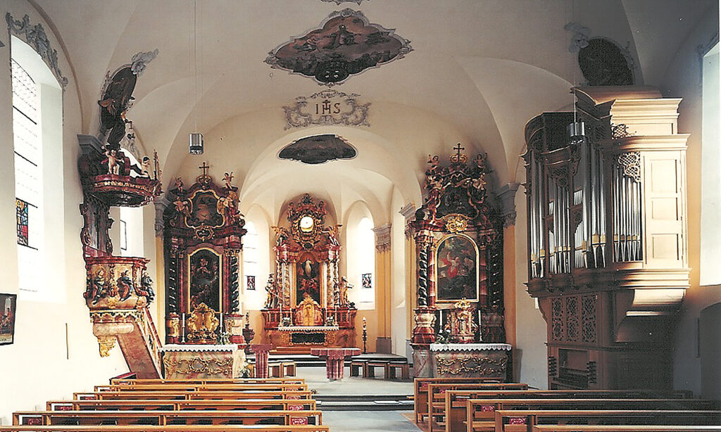 Die Pfarrkirche mit einem gotischen Chor und barockem Schiff wurde restauriert und erweitert, ohne die bestehende Substanz wesentlich zu verändern. Lediglich im Norden wurde mit Sichtbeton, Stahl und Glas ein neuer Anbau situiert, der sich klar von der historischen Bausubstanz absetzt. Die Beziehungen Kirche, Aufbahrung, windgeschützter Eingang und Emporenzugang wurden zusammengefasst. Durch diesen Anbau und durch das Versetzen des Kriegerdenkmals wurde der Außenraum neugestaltet, ein öffentlicher Platz an der Hauptstraße und ein ruhiger Platz hinter der Kirche über dem früheren Friedhof wurden gebildet. Im Kircheninnenraum wurden der Chor mit Altar, die Empore, die Sitzplätze neugestaltet, sowie die Fresken und barocken Altäre restauriert.
