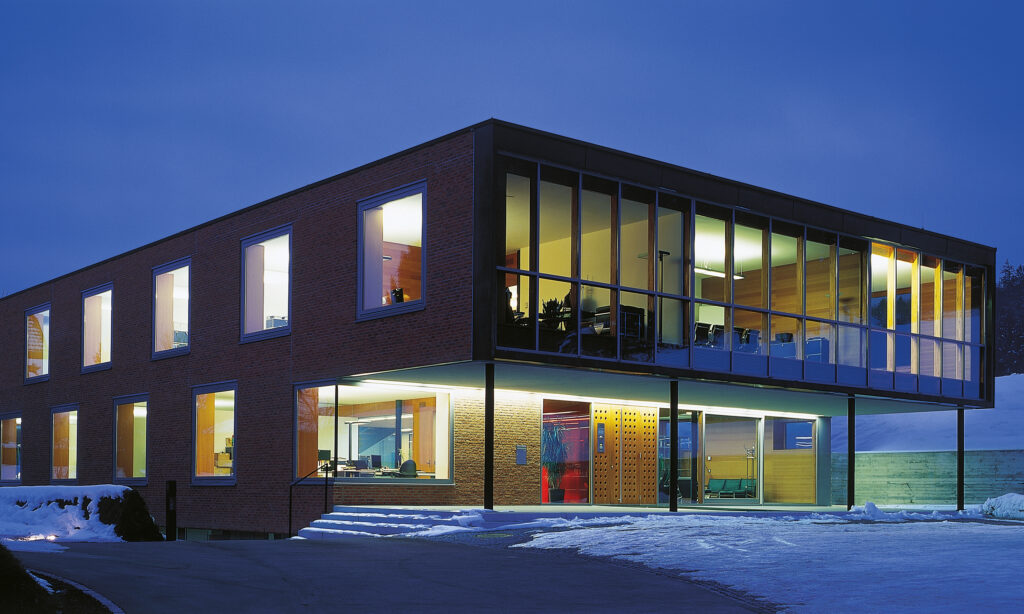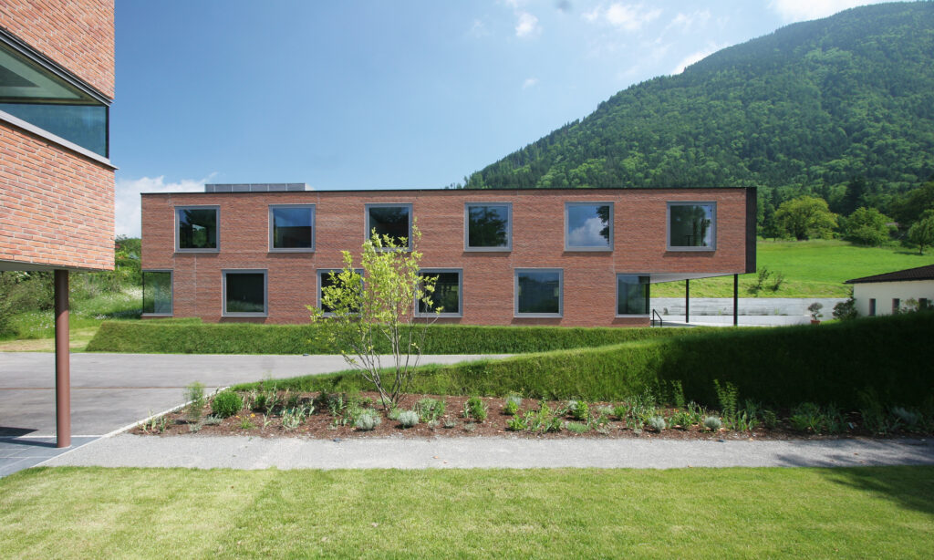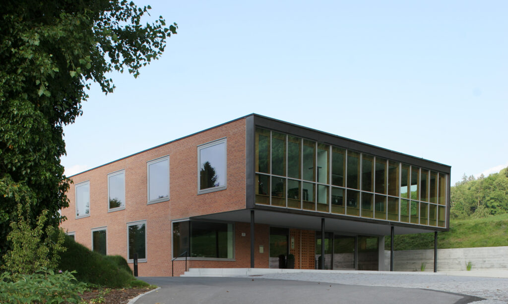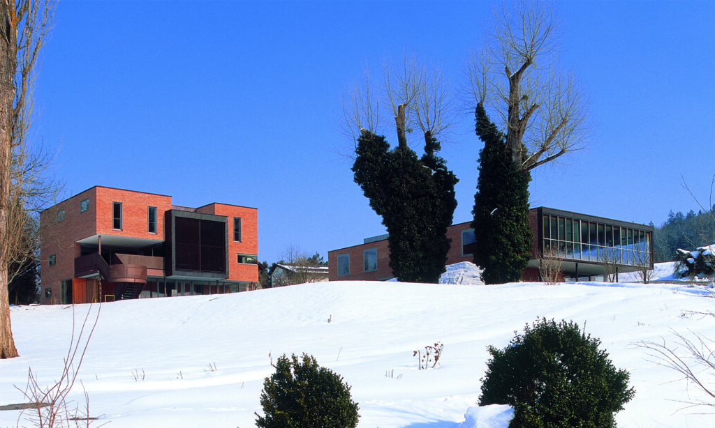 Das städtebauliche Konzept hat eine Gruppierung maßstäblich verschiedener Baukörper vorgesehen, die differenziert in die Landschaft gesetzt wurden. Kein Haus gleicht dem Anderen, allen gemeinsam ist jedoch die Materialisierung der Fassaden mit Klinkermauerwerk. Die bewusst gewählte Positionierung nimmt Rücksicht auf das sensible Terrain. Die unterschiedliche Typologie und Höhenentwicklung der Häuser erzeugt dabei einen interessanten Spannungsmoment. Der Baumbestand wurde soweit als möglich geschont bzw. durch Neupflanzungen ergänzt. Eine begrünte Dachlandschaft unterstützt die natürliche Einbettung der Gebäude in die Landschaft.