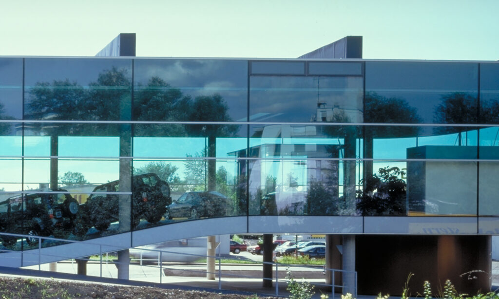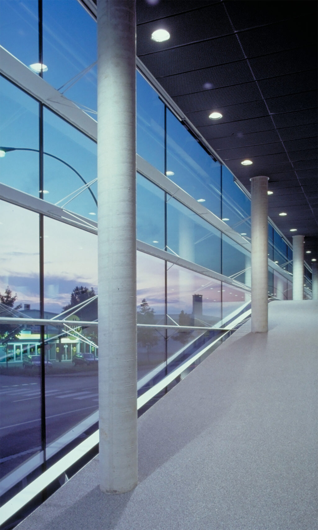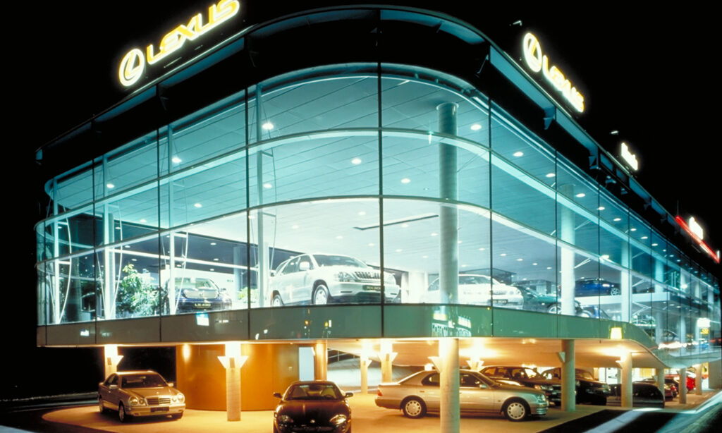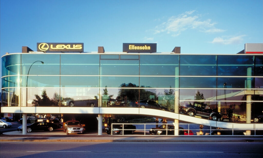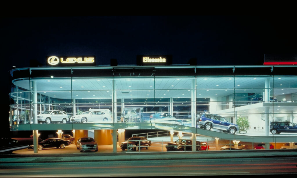 Die Auseinandersetzungen mit der vorhandenen Topographie und Typologie des Ortes entlang der Bundesstrasse wurden für die Disposition und Niveaus der verschiedenen Gebäudeteile genutzt und bildeten den Ausgangspunkt der städtebaulichen Entwurfsidee. Eine über die gesamte Gebäudetiefe reichende Rampe verbindet die beiden Hauptauststellungsbereiche TOYOTA und LEXUS. Diese Rampe wiederholt sich im Untergeschoss. Der TOYOTA Ausstellungsbereich ist zweigeschossig. Im Eingangsbereich ist die Halle über zwei Geschosse offen. Der gesamte Bereich dient vornehmlich der Autopräsentation. Die Info-Kundendienstzone sowie Lagerausgabe sind in einer offenen Struktur angeordnet. Verkaufskojen ergänzen das Raumprogramm. Das Obergeschoss wird über eine gebäudeinterne Rampenauffahrt erschlossen und ebenfalls als Ausstellungsfläche genutzt, wird aber auch für Mitarbeiterschulungen verwendet. Der LEXUS Ausstellungsbereich bildet den kopfartigen Gebäudeabschluss. Die Erschliessung erfolgt einerseits vom Terrain über die darunterliegende Glasrotunde, andererseits vom Toyota-Ausstellungsbereich.