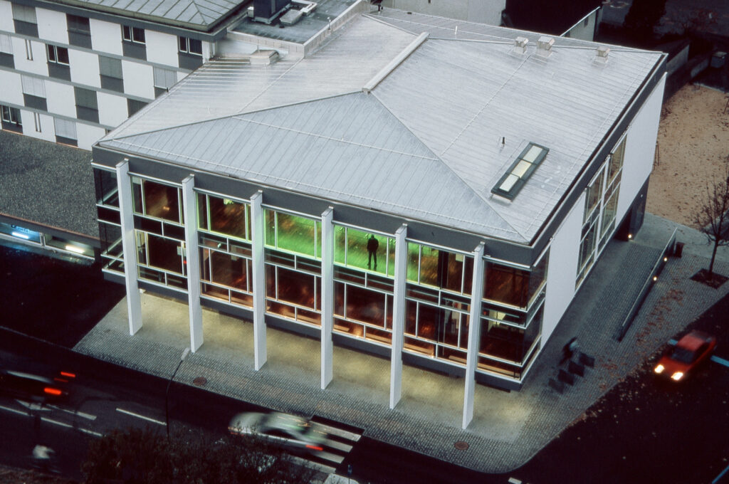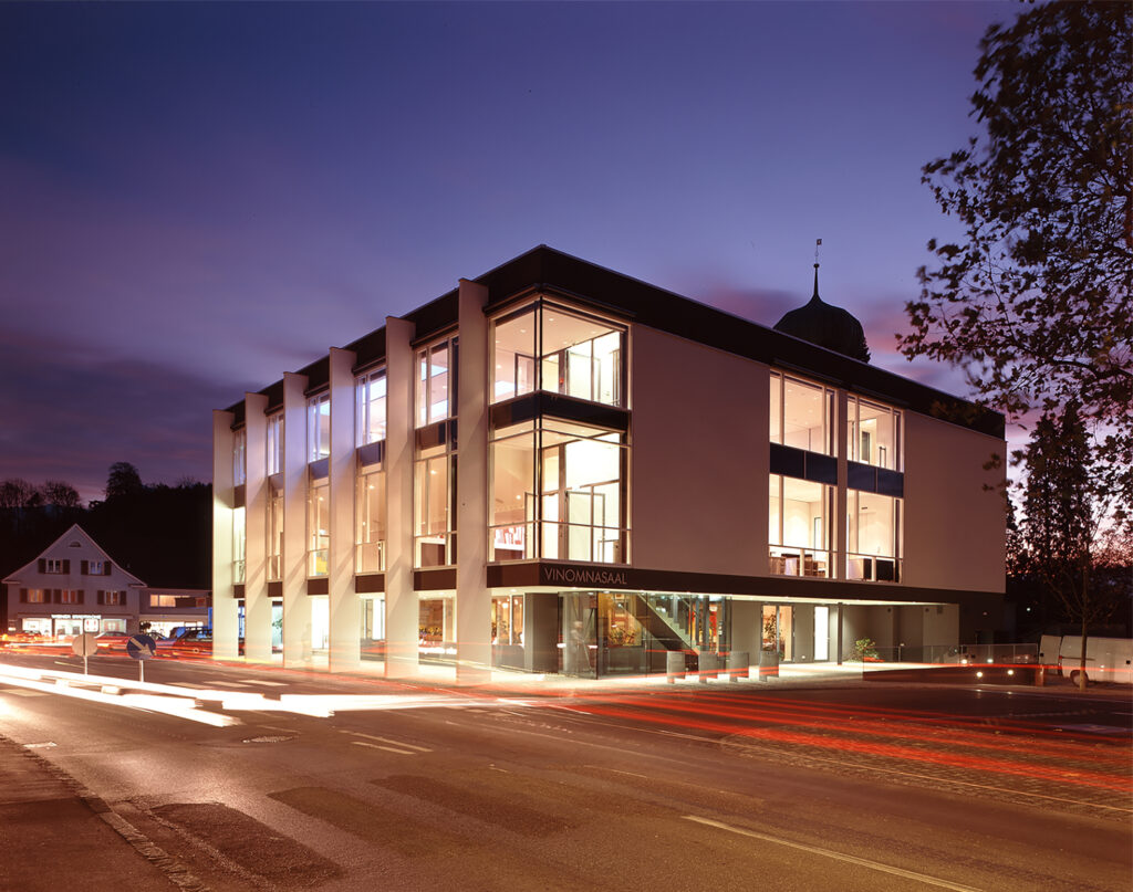 Die Erhaltung des Saales sowie der Standort waren umstritten. Zu groß schienen die Nachteile eines Saale im 1. Obergeschoss zu sein. Die Qualitäten des Gebäudes aus den 1960er Jahren wurden nicht erkannt. Zudem war eine Erweiterung nur in sehr begrenztem Maße möglich. Der bestehende Baukörper wurde in Richtung Postgebäude um eine Gebäudeachse erweitert. Damit wurden nutzbare Flächen auf allen Geschossen geschaffen. Im Erdgeschoss konnte die notwendige Fluchtstiege untergebracht werden, in den Obergeschossen abtrennbare Küchen- und Nebenräume geschaffen werden. Der Anbau wurde nicht als eigenständiger Bauteil verstanden, sondern, aus Respekt, in der Formensprache des Bestandes weitergeführt. Die Umbauarbeiten und Erweiterungen wurden behutsam vorgenommen. Das gesamte Gebäude wurde barrierefrei ausgeführt, durch ein neues Treppenhaus und Lifteinbauten. Die Lage des Saales im Ortszentrum sowie räumlich im 1. Obergeschoss bilden eine Bereicherung des Ortsbildes und Gemeindelebens. Die lichtdurchflutenden Räume bieten auch bei Tagesveranstaltungen schöne Ausblicke und in der Nacht wirkt das Haus von außen als heller, lebendiger, kultureller Mittelpunkt.