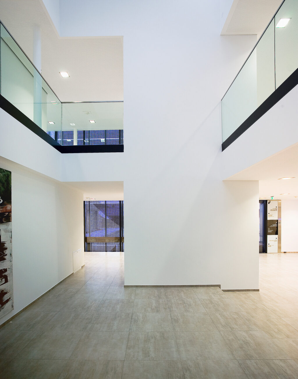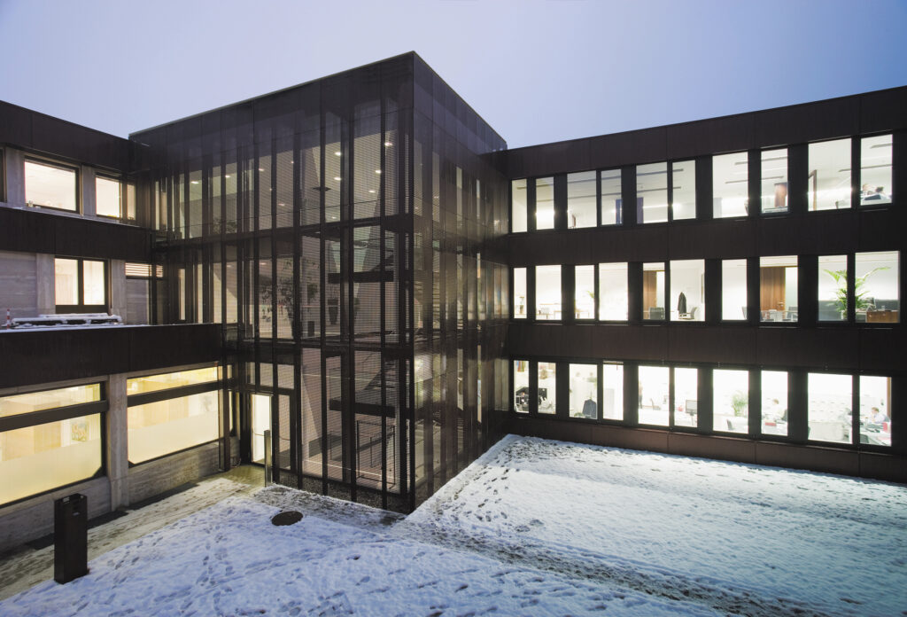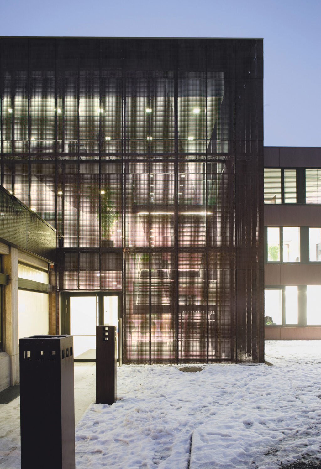 Das bestehende Bürogebäude mit drei Obergeschossen und zwei Untergeschossen wurde um einen Trakt erweitert. Verbunden sind die zwei Gebäude über die neue Halle samt Stiegenhaus. Letzteres dient auch der Erschließung eines zukünftigen dritten Traktes, welcher in der nächsten Etappe verwirklicht wird. Das Hauptaugenmerk liegt auf dem Stiegenhaus mit einer gelochten, transluzenten Aluminiumfassade, welche das Alte vom Neuen trennt.